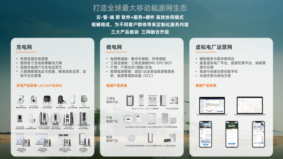 “双碳”背景下,聚焦“出行&能源减排”:深耕绿色能源新赛道,以“源网荷储充放售”一体化的综合解决方案为有力抓手,通过“云-管-端”高效协同模式,为工商业、园区、楼宇等公共配套,甚至城市级场景提供低成本、高效率的综合智慧能源解决方案,助力实现低碳、甚至“零碳”排放。通过“充电+能源”的组合,可实现从新能源汽车充电到能源生产、存储、管理、消纳、交易的全产业链布局和持续升级,利用工业互联网技术,一端实现能源互联,一端实现产业互联,最终构建集“充电网、用户网、能源网”于一体的三网融合平台。