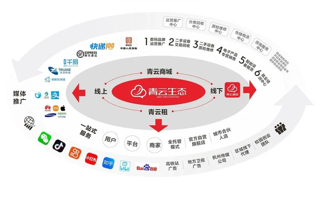 青云生态是中锦裕荣集团倾力打造的集线上平台和线下门店于一体的综合服务生态,提供数码科技产品供应链管理与数字化综合信息咨询服务,在全国范围内进行立体式渠道布局、建立大数据风控模型,并开展多元化全域运营推广服务等,实现了从产品源头到销售终端的全链条覆盖。其中包括产品销售与租赁板块、二手商品业务板块、产业上下游服务板块、创业与培训板块、环保板块、金融服务板块等,致力于成为中国二手设备回收交易行业独角兽科技服务企业。