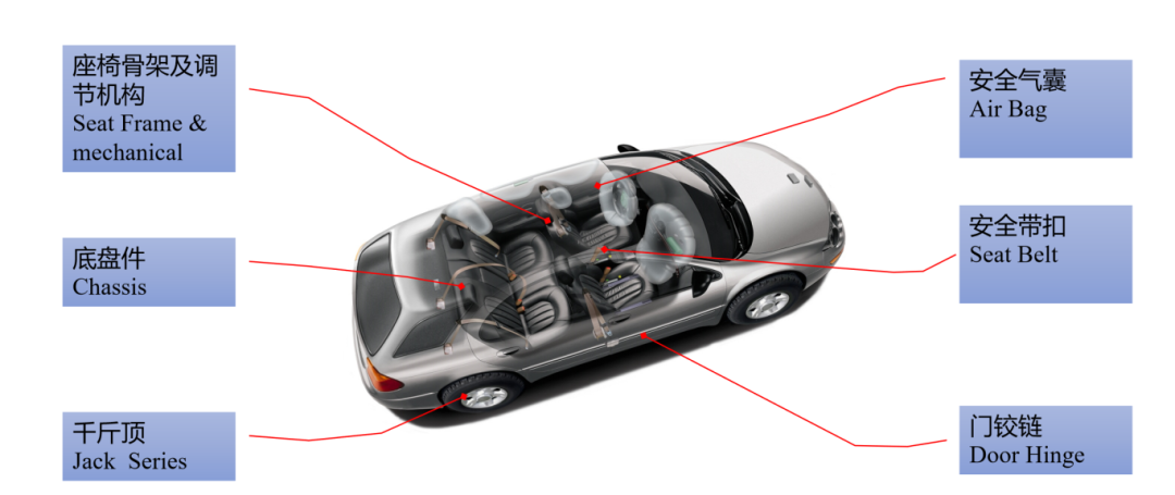 产品涵盖汽车座椅用各种冷冲压部件,为一汽大众、上海大众、BYD、吉利、沃尔沃、理想、奇瑞等国内汽车制造商配套生产各种型号的精密冷冲压件。