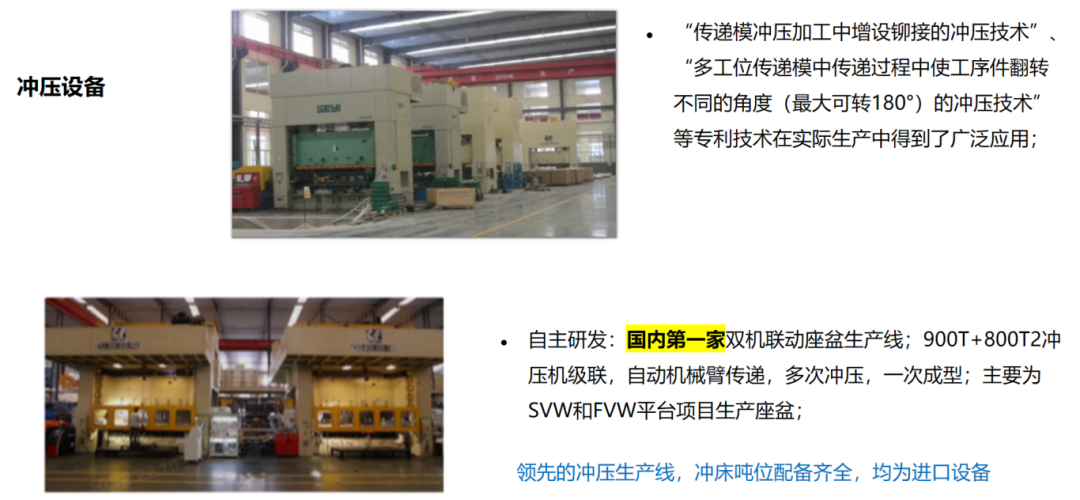 主要面向东北高端车系座椅市场,主要客户为沈阳海德世,佛吉亚,BK6北美出口等,拥有行业领先的现代化标准厂房,冲压坐盆连线、焊接自动化标准三线,装配侧板自动化生产线领先同行业。