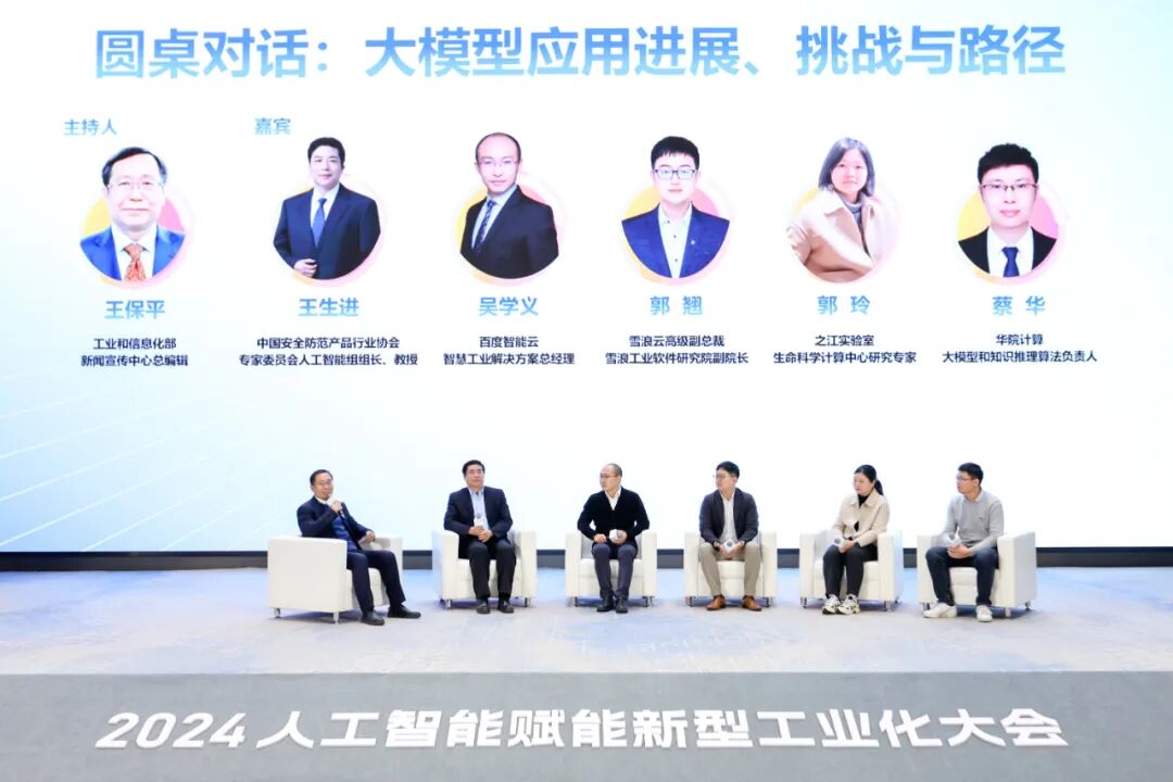 大会设置了专家交流环节。圆桌对话环节由工业和信息化部新闻宣传中心总编辑王保平主持,雪浪云高级副总裁、雪浪工业软件研究院副院长郭翘与中国安全防范产品行业协会专家委员会人工智能组组长、清华大学教授王生进、百度智能云智慧工业解决方案总经理吴学义、之江实验室生命科学计算中心研究专家郭玲和华院计算大模型和知识推理算法负责人蔡华共同围绕“大模型应用进展、挑战与路径”主题,展开思想碰撞。