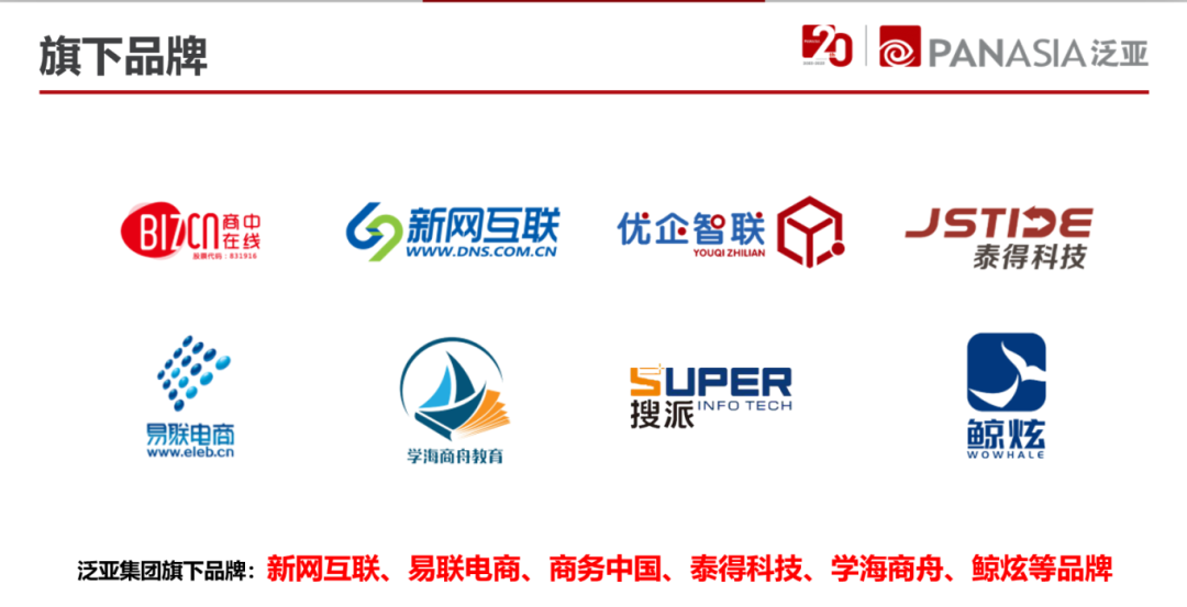 泛亚产品体系主要分为互联网基础服务、网络推广、电子商务、增值服务四大类别。互联网基础服务以域名、虚拟主机、智能建站、云主机及系统定制开发等产品及服务为主,为客户提供企业互联网化的钥匙,携手企业进入互联网时代。泛亚网络推广服务,主要与百度、360、抖音、阿里巴巴、快手、腾讯等全球知名企业及平台合作,为客户提供多样的网络展现,让网络营销更高效更便捷,带来更多商机。泛亚电子商务服务可以为客户提供B2B、B2C、直销、分销、DRP、CRM等多种电商解决方案,一站式系统化的为客户解决电商难题。