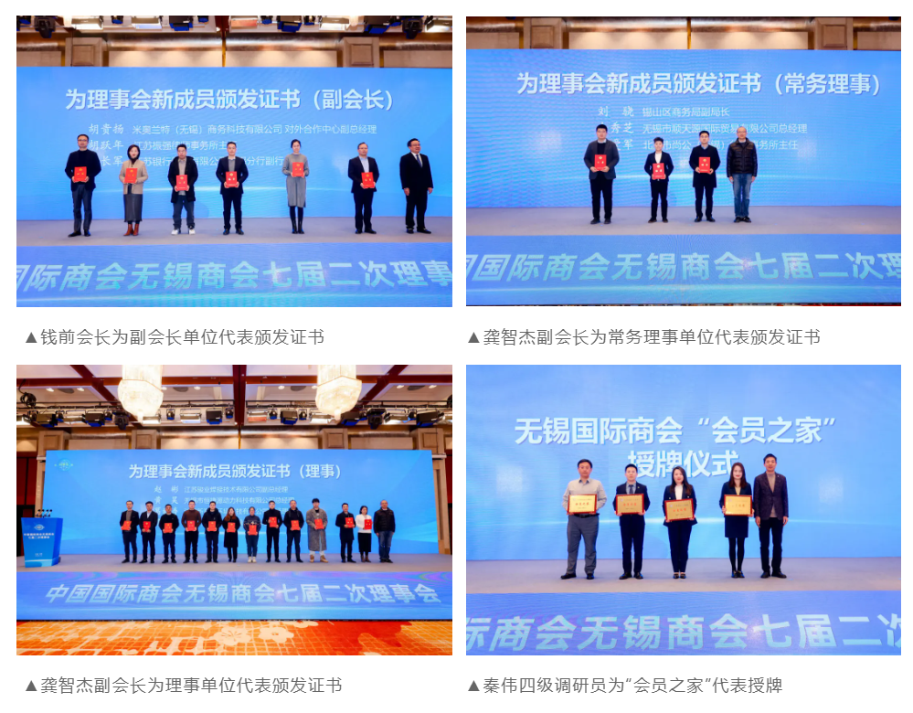 理事会审议、表决通过了无锡国际商会七届二次理事会工作报告、新增及变更成员名单,并公布了“会员之家”品牌。