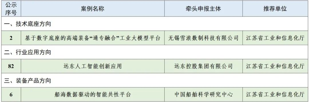 近日,工业和信息化部科技司公示了人工智能赋能新型工业化典型应用入选案例名单,无锡雪浪数制科技有限公司、远东控股集团有限公司、中国船舶科学研究中心等3家单位入围,数量占全省的30%,排名第二,其中雪浪数制在“技术底座方向”上排名全国领先,为我市争创国家人工智能创新应用先导区提供了强有力的支撑。