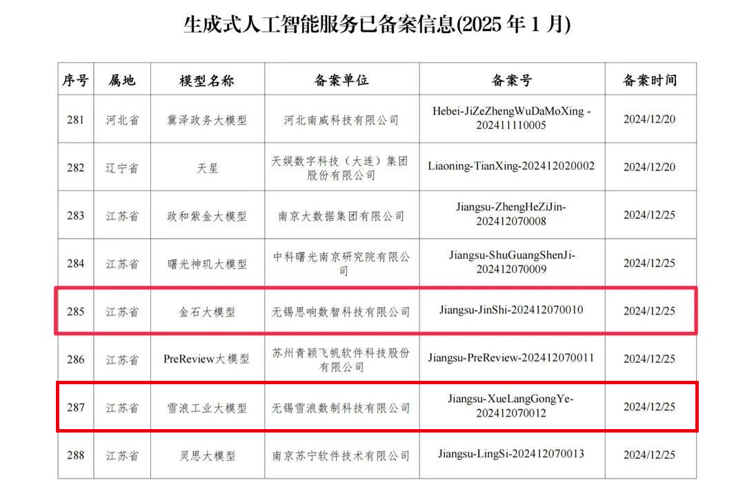 近日,国家互联网信息办公室发布了关于2024年生成式人工智能服务已备案信息的公告,金石大模型、雪浪工业大模型通过备案,实现了无锡大模型备案零的突破。