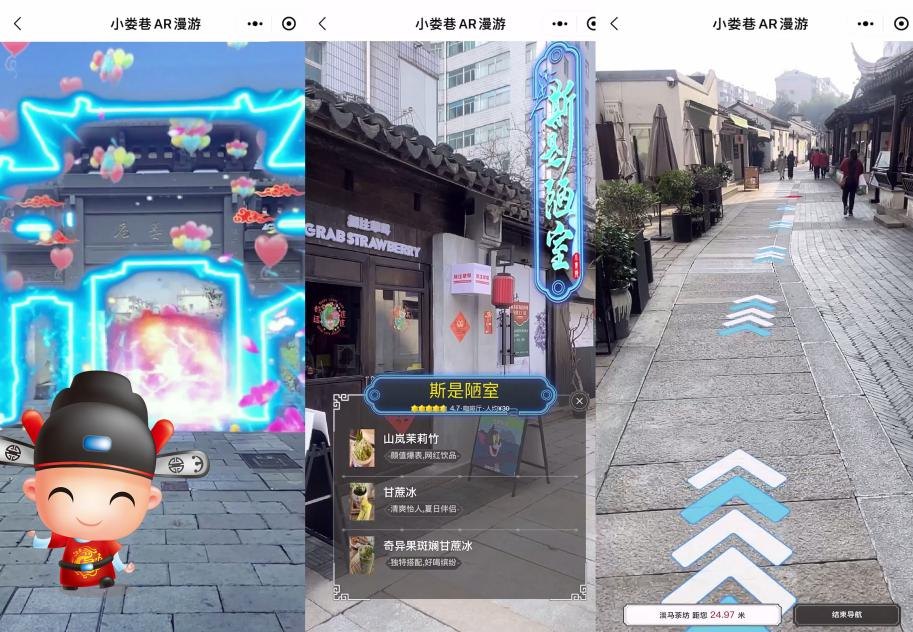 针对梁溪区的热门文旅资源,梁溪区数据局挑选无锡城区现存历史最久、可塑性较强的“才子巷”小娄巷作为试点,基于时空GIS点位信息,融合二三维地图数据,通过数字孪生模型数据处理服务,结合AR技术,创新打造出小娄巷的AR漫游手机程序,可实现“小状元”数字人讲解、AR导览、互动游戏、商品推荐等6种互动服务,通过厘米级运动跟踪和云端渲染,为游客带来虚实融合的个性化互动旅游体验,也为探索打造差异化江南街区提供新思路。目前已接入67家商铺信息,在小娄巷入口、佚园、财神殿等7处设立AR虚拟空间打卡。搭配魅力梁溪手机小程序,向游客提供语音讲解、便民地图、车位导航等出行服务。目前已汇聚小娄巷内15个景点故居的语音讲解,还支持室内精准定位,游客路过景点或文物时可自动识别播放讲解。此外,提供周边54个停车场、公厕、药店等公共服务场所指引。