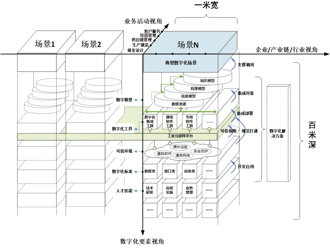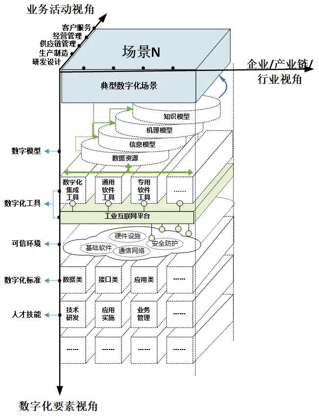 场景本身是人、机、物、法、环的有机组合,数字化转型就是运用数字技术重组场景要素资源、重塑场景业务流程、优化价值输出。利用系统工程方法,参考联邦企业体系结构框架(FEAF)等理论,对场景数字化体系架构进行分析解构。从场景的基础层看,场景的数字化转型主要包括数字化基础设施、数字化专业人才、数字化标准规范等,形成场景的数字化底座,支撑场景开展数字化改造。从场景的应用层看,基于服务器、云平台、安全网关等基础设施,运行数字化集成工具、通用工具、专用工具、工业互联网平台等工具软件,进而对场景中核心业务活动产生的数据资源、信息资源进行采集、应用和分析,形成一系列机理模型、知识模型、智能模型,让原有的“哑设备”“黑箱运行”数字化、透明化。通过对场景的解构分析,提出一套场景的数字化体系架构(图 1)。并基于场景的数字化体系架构,进一步分析影响场景数字化转型的内外部关键因素,提出场景数字化转型的解决路径。