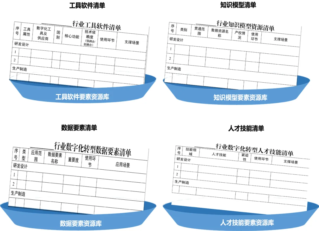 结合数字化转型场景图谱,摸排知识模型、工具软件、数据要素、人才技能等需求,形成四类要素清单(图 6),推动数据、模型、工具以及数字化解决方案等的自主化研发和模块化封装,加快工具、数据、模型等要素的平台化沉淀和网络化共享,加速产业链和供应链向产业网络和供应网络演进。